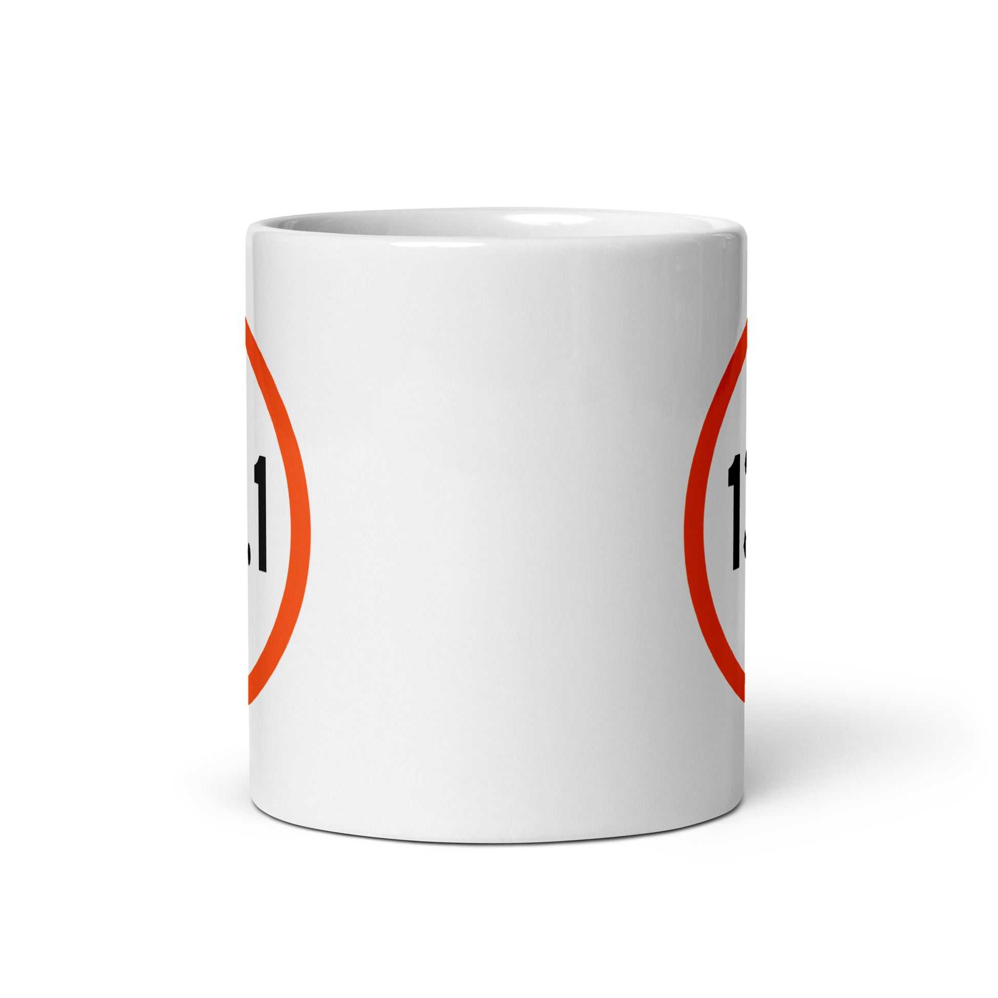 This minimalist mug features the iconic half marathon distance set inside a bold orange circle — a simple symbol recognised instantly by runners.