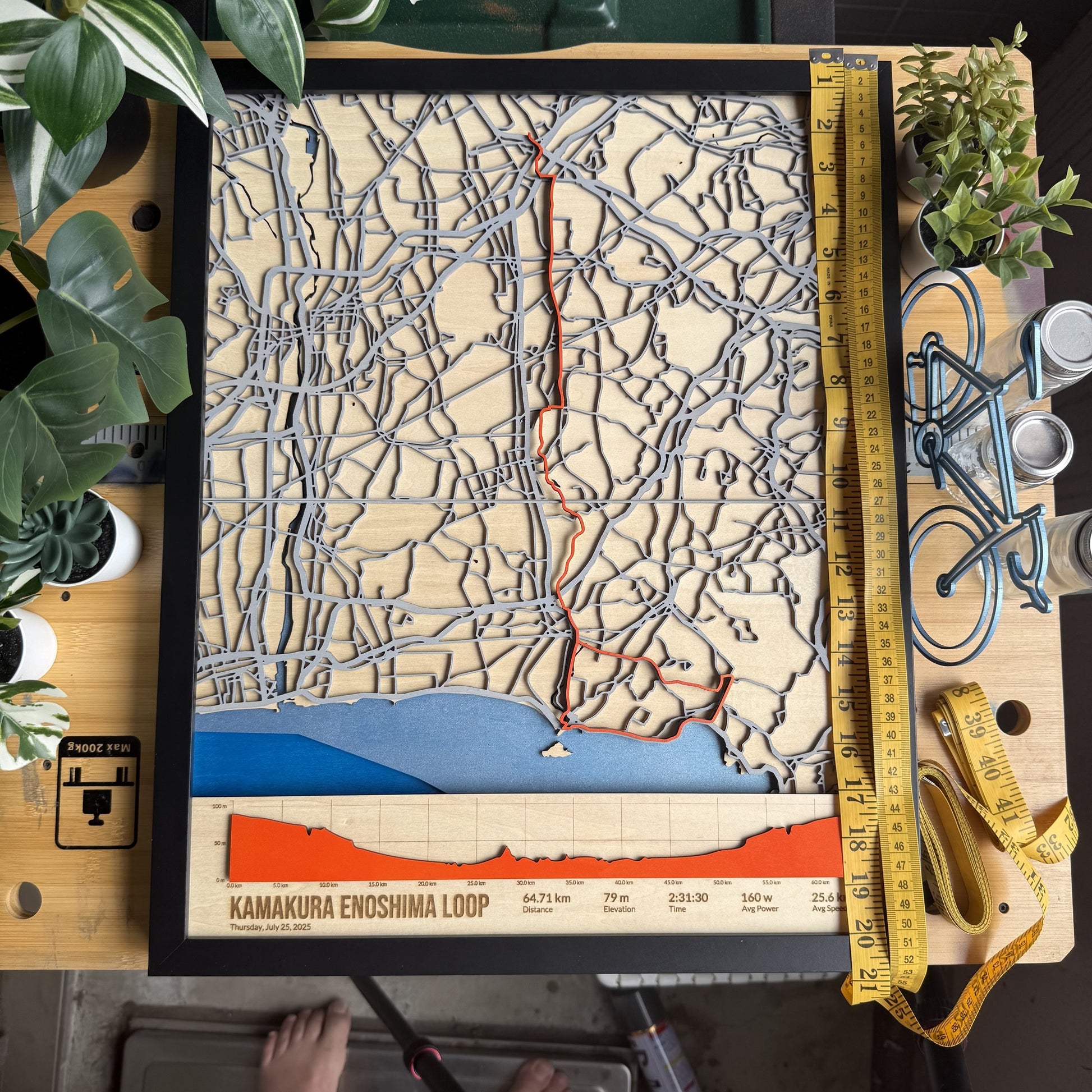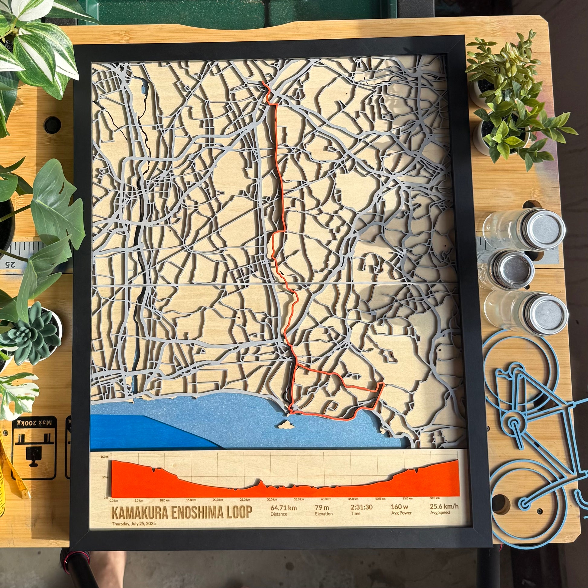 This handcrafted wooden cycling map captures one of my favourite routes in Kanagawa, looping from Minami-Machida through Fujisawa, Kamakura, and out to Enoshima.