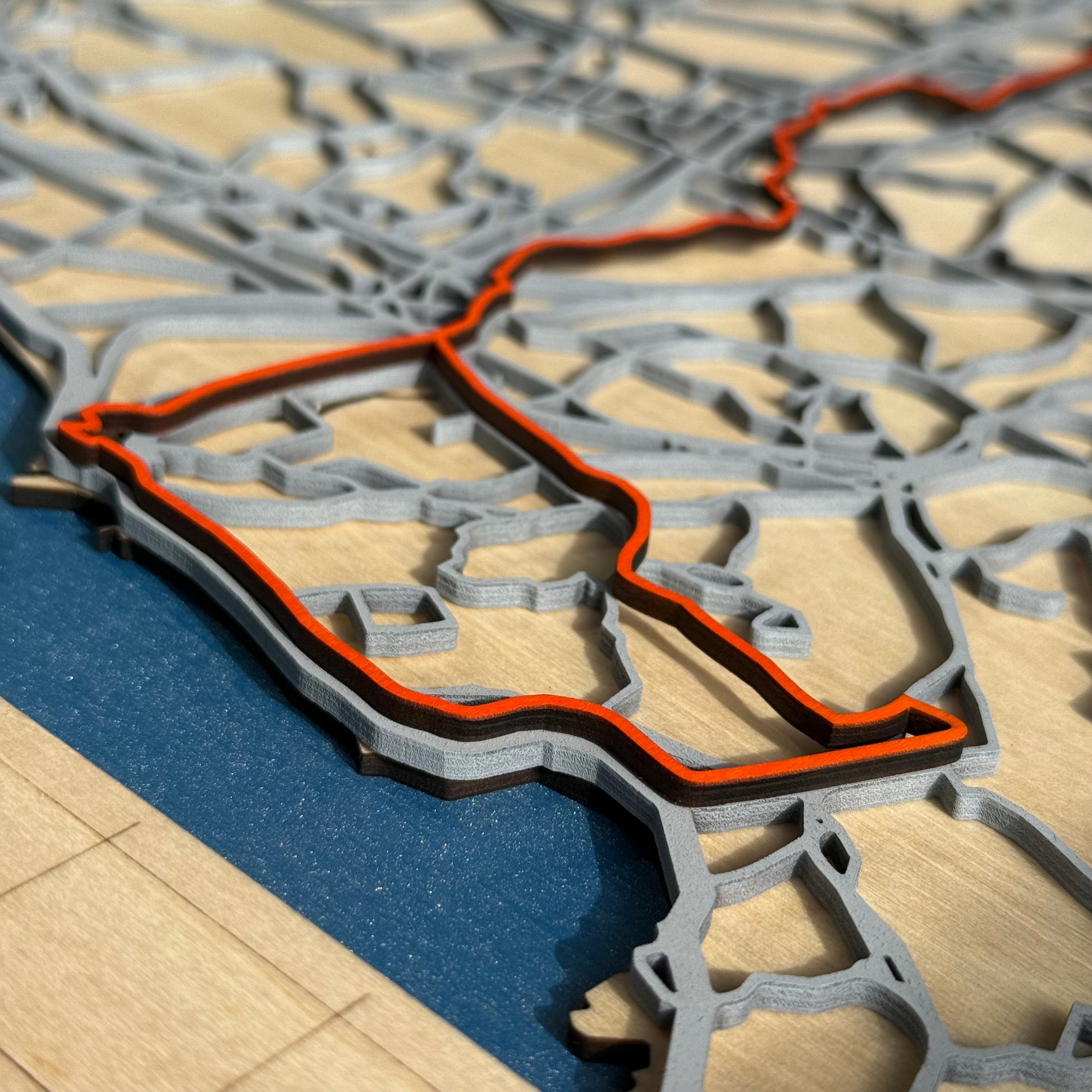The ride blends urban roads, coastal views, and historic streets, and has been translated into layered wood to preserve both the geography and the emotion of the journey.