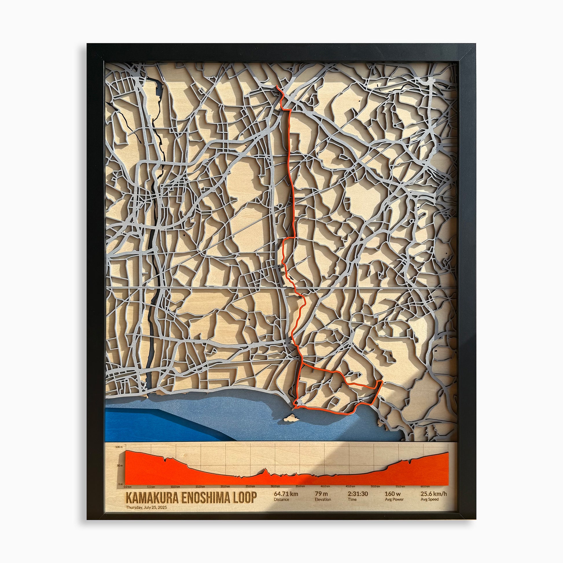 The route passes Kamakurakokomae Station, where fans gather daily to recreate one of anime’s most recognisable scenes, with the Enoden Line train running along the coast. This stretch of road—sea, rail, and sky—was the inspiration for my very first wooden cycling map, making this piece especially meaningful to me.